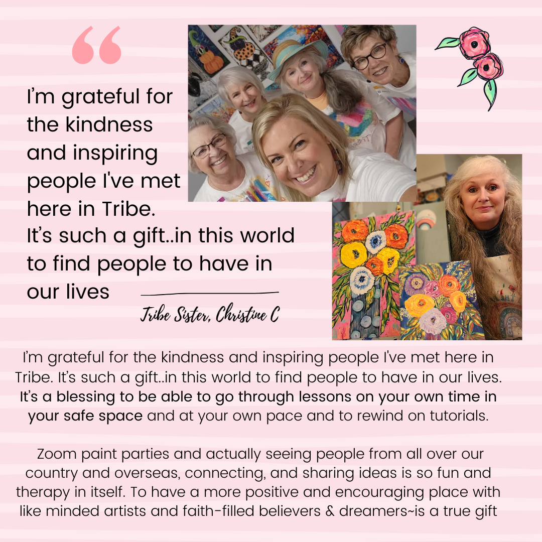 I’m a newbie to the Tribe and it is the best thing I’ve ever done for myself! Christie is such a fun and kind and talented teacher! She’s REAL not stuffy! LOL!! I am learning so much from her ... The Tribe sisters are the best, giving encouragement and advice when asked.