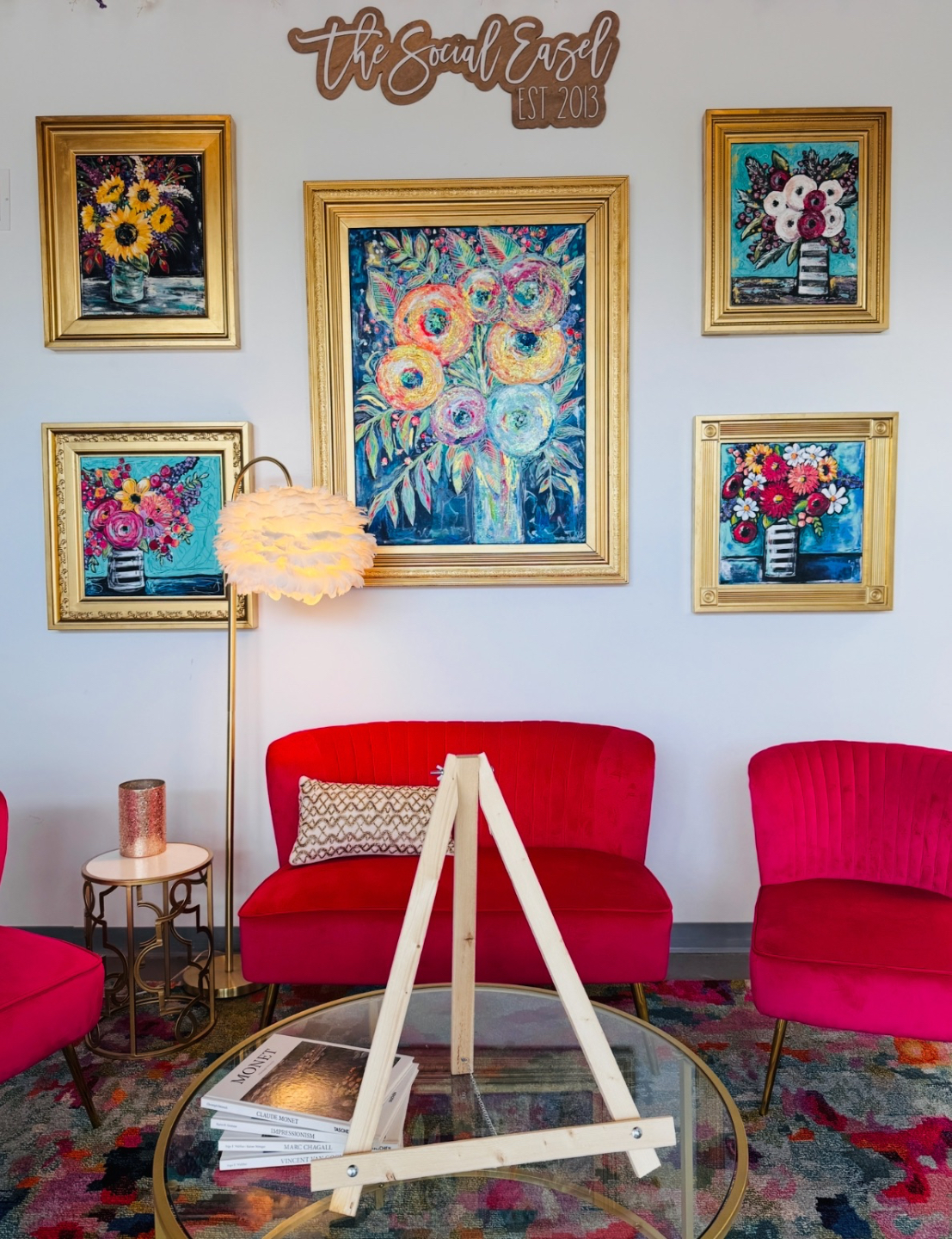 When The Social Easel first started, my husband Corey built me a set of 10 custom wooden easels and it grew from there! I used them for six years in my paint party business, and I still use them to this day — 12 years later!